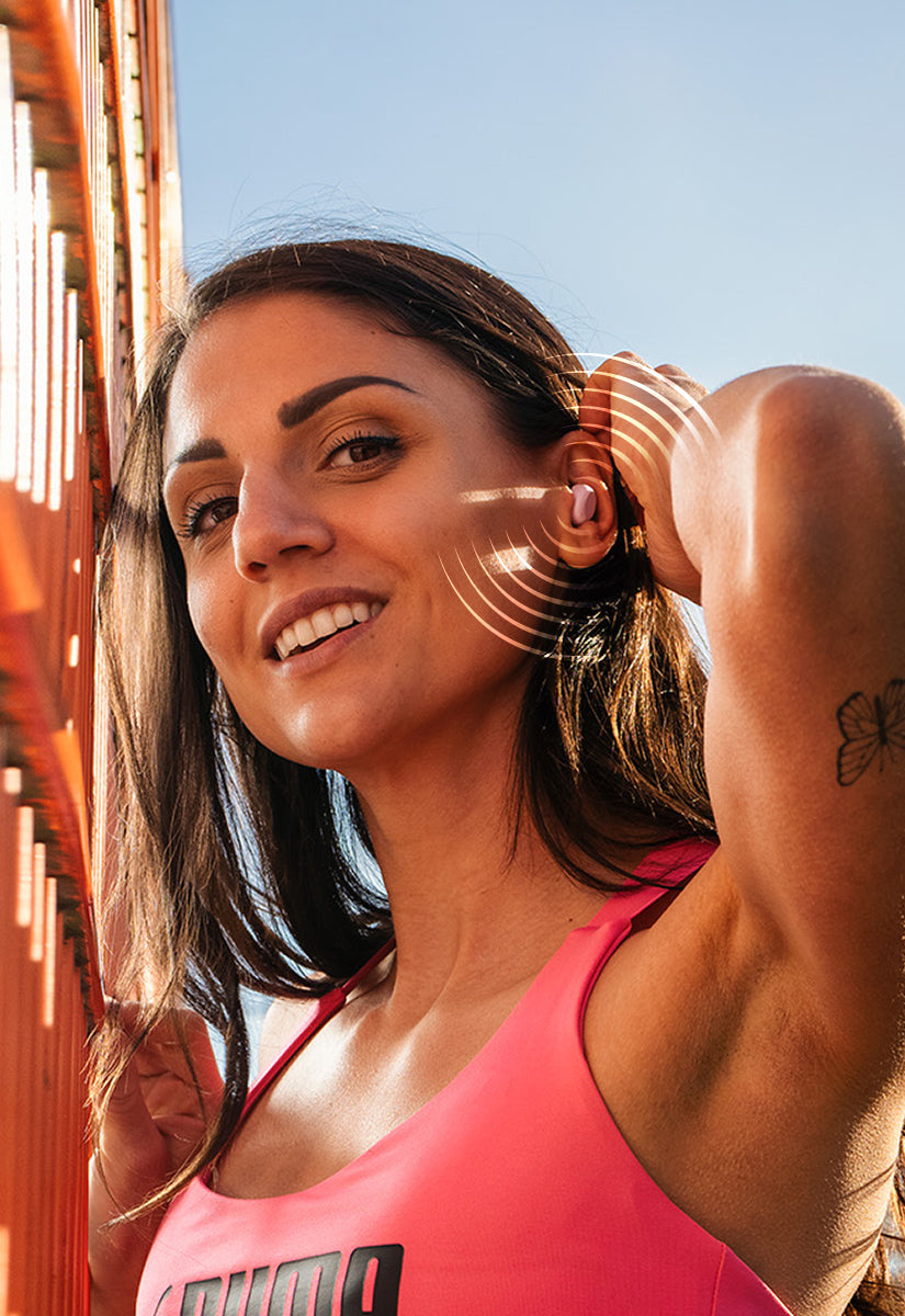 Sperimentate una vestibilità perfetta e un suono senza compromessi. Gli auricolari wireless più piccoli sul mercato, che combinano audio cristallino, design elegante e comfort di alto livello. TinyS rimane nelle orecchie in ogni situazione.